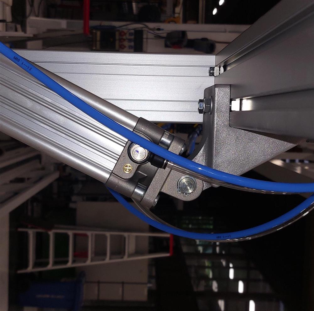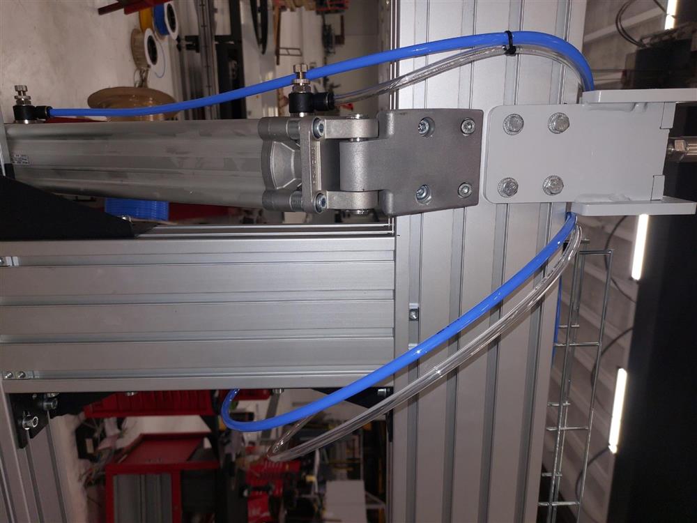 The hinge point functions as the connection between the carpet rolling mechanism and the pneumatic cylinder that drives it. For the machine to operate correctly, the cylinder must follow a defined movement path that ensures controlled tension on the carpet as it is rolled. Any deviation in this path changes the pressure distribution across the roll. This can cause inconsistent winding or increased need for operator intervention. Because the hinge angle determines the initial alignment of the cylinder, the part must be manufactured with high geometric accuracy and repeatability.